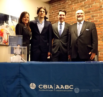 Mme Elithaki Katsipis, représentante de l'AABC, M. Hugo Van Branteghem, gagnant de la carte Visa prépayée de 100 $, M. Renaud Charest, président de la section de droit des Étudiants et étudiantes, et Me Stéphane Lacoste, président de l'ABC-Québec.